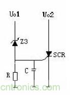 如上圖,當(dāng)Uo1輸出升高,穩(wěn)壓管(Z3)擊穿導(dǎo)通,可控硅(SCR1)的控制端得到觸發(fā)電壓,因此可控硅導(dǎo)通。Uo2電壓對地短路,過流保護電路或短路保護電路就會工作,停止整個電源電路的工作。當(dāng)輸出過壓現(xiàn)象排除,可控硅的控制端觸發(fā)電壓通過R對地泄放,可控硅恢復(fù)斷開狀態(tài)。