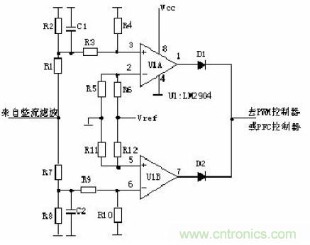 Q1關(guān)斷時施放能量。D1是啟動二極管。D2是PFC整流二極管,C6、C7濾波。PFC電壓一路送后級電路,另一路經(jīng)R3、R4分壓后送入PFC控制器作為PFC輸出電壓的取樣,用以調(diào)整控制信號的占空比,穩(wěn)定PFC輸出電壓。