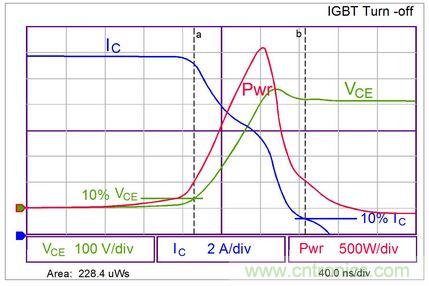 導(dǎo)電損耗的量測(cè)方式類似。它們應(yīng)當(dāng)起于導(dǎo)通損耗終點(diǎn),終于關(guān)閉損耗起點(diǎn)。這可能難于精確量測(cè),因?yàn)閷?dǎo)電損耗的時(shí)間刻度遠(yuǎn)大于