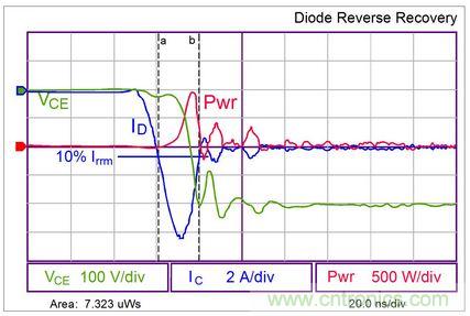 一般而言,在電壓波形的峰值,IGBT將導(dǎo)電,而二極管不導(dǎo)電。為了量測(cè)二極管損耗,要求像電機(jī)這樣的無功負(fù)載,且需要捕獲電流處于無功狀態(tài)(如被饋送回電源)時(shí)的波形。