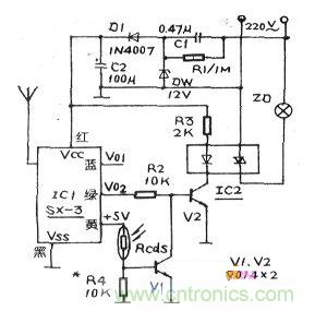 IC1是一只SX-3型人體接近開關(guān)集成電路模塊,該器件最大探測(cè)距離可達(dá)10米。其中紅線接正電源端,黑線接公共端,黃線為+5v電源輸出端,供外部使用,藍(lán)線為即時(shí)開關(guān)信號(hào)輸出端(本電路不用),綠線為具有時(shí)間累積功能的延時(shí)開關(guān)信號(hào)輸出端。220V市電由C1降壓、D1整流、C2濾波、DW穩(wěn)壓后為控制電路提供12V直流電源。平時(shí),沒有人接近IC1或當(dāng)行人很快從報(bào)欄前經(jīng)過時(shí),IC1的VO2端輸出低電平,后級(jí)電路不動(dòng)作,燈不亮。當(dāng)有人要看報(bào)在報(bào)欄前停頓數(shù)秒后,IC1的V02端輸出高電平。白天時(shí),光敏電阻Rcds為低阻值,V1導(dǎo)通,V2截止,后級(jí)電路仍不能工作。晚聞Rcds為高阻值,V1截止,的高電平使V2導(dǎo)通,光電耦合器IC2內(nèi)藏發(fā)光二極管發(fā)光,光敏可控硅開通,燈泡ZD發(fā)光。閱報(bào)者離開后,IC1V02端又變?yōu)榈碗娖?,ZD自動(dòng)熄滅。