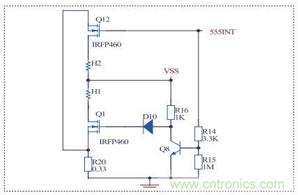 主要把NE555D產(chǎn)生的一個(gè)36.7KHZ的脈沖功率放大,經(jīng)發(fā)射線圈發(fā)射出去。當(dāng)脈沖為高電平時(shí),Q12柵極為高電平,Q12導(dǎo)通,此時(shí)Q8飽和,Uceq電壓只有0.67V,經(jīng)D10-4148后Q1柵極電壓為0,Q1截止。當(dāng)脈沖為低電平時(shí),Q8、Q12同時(shí)截止,電流直接由R16 D10 Q1,Q1導(dǎo)通。整個(gè)過程中Q1與Q12均以一開一關(guān)的形式工作。電路如圖2:
