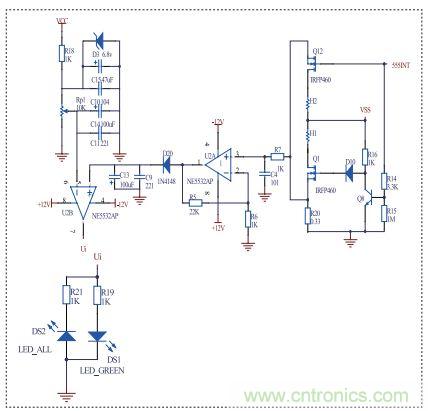 當(dāng)有感應(yīng)負(fù)載時(shí),R20(0.33歐)電阻上的電壓會(huì)增大,經(jīng)運(yùn)放U2A放大A=1+R5/R6=23倍后,電壓變化明顯,再經(jīng)過1N4148整流濾波,得電壓U1與基準(zhǔn)源Uo比較,此時(shí)U1>Uo,運(yùn)放輸出Ui為高電平,七彩燈閃爍;當(dāng)感應(yīng)負(fù)載充滿電(或沒有感應(yīng)到負(fù)載),此時(shí)U1<Uo,運(yùn)放輸出Ui為低電平,綠燈亮。