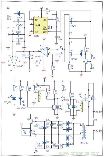 斷電后,繼電器K2閉合,此時(shí)C5與R13構(gòu)成RC放電電路,給C5快速放電。當(dāng)按一下輕觸復(fù)位開關(guān)時(shí),充電器重新啟動(dòng)。當(dāng)感應(yīng)負(fù)載充滿電(或無感應(yīng)負(fù)載)時(shí),電容C5充電,其電壓為Ut 由公式Ut=12*(1-e-t/R9C5)得:t=-R9C5ln(1-Ut/12) 其中C5=100UF,R9=1MΩ,Ut=1.34V, 經(jīng)計(jì)算得斷電時(shí)間:t=10S 實(shí)現(xiàn)了10秒自動(dòng)斷電。在綠燈亮的10秒內(nèi)只要有感應(yīng)負(fù)載,則Ui為高電平,Q3飽和,電容C5放電。整個(gè)充電過程實(shí)現(xiàn)智能化斷電。