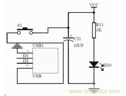 此最小系統(tǒng)中的電源供電模塊的電源可以通過計(jì)算機(jī)的USB口供給,也可使用外部穩(wěn)定的5V電源供電模塊供給。電源電路中接入了電源指示LED,圖中R11為LED的限流電阻。S1為電源開關(guān)。
