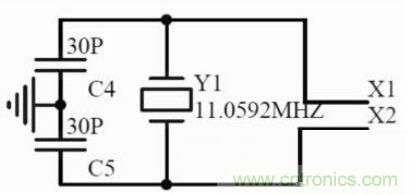 STC89C51使用11.0592MHz的晶體振蕩器作為振蕩源,由于單片機(jī)內(nèi)部帶有振蕩電路,所以外部只要連接一個(gè)晶振和兩個(gè)電容即可,電容容量一般在15pF至50pF之間。