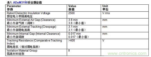 ADuM3190采用小型16引腳QSOP封裝,隔離電壓額定值為2.5 kV rms。 ADuM3190的安全額定值如表1所示。