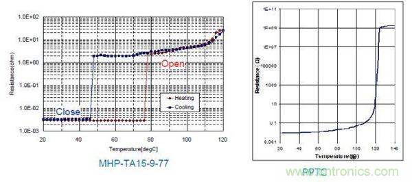 因此,不論哪種方式的快速充電,都是通過(guò)提高充電電流或功率來(lái)加速鋰電池芯內(nèi)部的反應(yīng)來(lái)實(shí)現(xiàn)的,必須通過(guò)更多的保護(hù)來(lái)防止由于電池芯的熱失控而引起的起火甚至爆炸。TE的PPTC和MHP-TA 可以有效地提供這種保護(hù),MHP-TA是結(jié)合了雙金屬片和PPTC的溫度/電流保護(hù)器件,溫度保護(hù)更加精確,可以適用于電流較大、溫度保護(hù)要求更高的電子設(shè)備,如:智能手機(jī)、平板電腦、超級(jí)本、筆記本電腦等。MHP-TA及PPTC的特性及應(yīng)用如下圖,緊貼電池芯的設(shè)計(jì)可以使MHP-TA和PPTC更好的感測(cè)電池溫度,當(dāng)電池溫度異常升高時(shí)可以呈現(xiàn)高阻,阻礙電池的充放電電流,確保電池的安全使用。