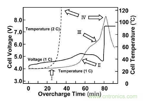 下圖是鋰離子電池過(guò)充電測(cè)試的一個(gè)事例??梢钥闯龀潆娺^(guò)程中鋰離子電池芯內(nèi)部溫度和電壓的變化情況,正常1C充電時(shí),電池芯的溫度隨恒流充電慢慢升高,而隨恒壓階段電流減小慢慢降低,整個(gè)過(guò)程溫度可控,安全。當(dāng)大電流(2C或以上)時(shí),電池芯內(nèi)部反應(yīng)劇烈發(fā)生熱失控,溫度急劇升高而發(fā)生起火或爆炸。