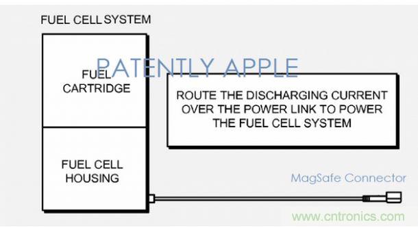 在這種專利一種可能的實(shí)施方案中,蘋果的燃料電池,可以作為一個(gè)獨(dú)立的供電模塊,通過MagSafe連接線纜和蘋果筆記本電腦連接。不過蘋果也表示,這種供電設(shè)備可以采用市面上的其他線纜,除了供電之外,線纜還可以作為電子設(shè)備和燃料電池之間的通信管道。