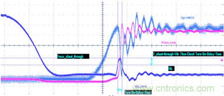 測(cè)試的目的是看上MOS管導(dǎo)通時(shí),有沒(méi)有同時(shí)把下管打開(kāi),從而導(dǎo)致電源直接導(dǎo)通到地而引起短路。如圖三所示藍(lán)色曲線(Vgs_Lmos)就是下管在上管導(dǎo)通的同時(shí),被帶了起來(lái),如果藍(lán)色曲線的被帶起來(lái)的尖峰超過(guò)了MOS管的Vth要求,同時(shí)持續(xù)時(shí)間(Duration)也超過(guò)了datasheet要求,從而就會(huì)有同時(shí)導(dǎo)通的風(fēng)險(xiǎn)。當(dāng)然,這是大家最常見(jiàn)到的情況。