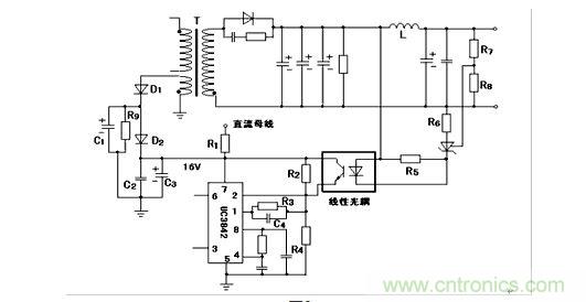 圖2 用UC3842驅(qū)動(dòng)開(kāi)關(guān)電源構(gòu)成開(kāi)關(guān)電源的原理圖
