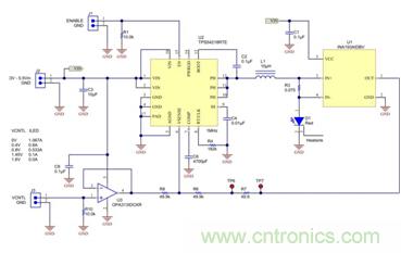 圖1顯示的是一個(gè)通過高側(cè)感測(cè)電阻器R3直接驅(qū)動(dòng)LED中電流的降壓轉(zhuǎn)換器,TPS54218,同步降壓控制器。這個(gè)電流感測(cè)電壓被電流感測(cè)監(jiān)視器,INA193,放大20倍,這樣可顯著地降低R3中的功率耗散并提升效率。分流監(jiān)視器的電流反饋信號(hào)輸出給電阻分壓器 (R6/R8),這形成了到VSENSE的完整反饋路徑。