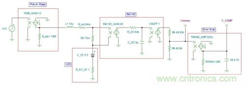 圖2是仿真控制回路的圖1的簡(jiǎn)單SPICE模型。VC1是COMP引腳上的電壓,直接驅(qū)動(dòng)跨導(dǎo)增益為13的功率級(jí)(控制器更多的內(nèi)部細(xì)節(jié)請(qǐng)參見TPS54218數(shù)據(jù)表內(nèi)的圖31)。這個(gè)電流通過電感器和感測(cè)電阻器來直接驅(qū)動(dòng)LED。需要注意的是,電感值和LED值的變化不會(huì)對(duì)響應(yīng)產(chǎn)生影響,這是因?yàn)殡姼衅髦械碾娏魇艿搅丝刂啤?/div>