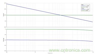 外部補(bǔ)償組件C6從這個(gè)點(diǎn) (V_COMP) 上接地。需要注意的是,V_COMP也是我們回路仿真的起始點(diǎn) (VC1)。回路增益是V_COMP引腳上測(cè)得的電壓除以VC1上的注入擾動(dòng)。所以,通過將VC1設(shè)定為1 Vac信號(hào),回路增益最終就是V_COMP上測(cè)得的電壓。