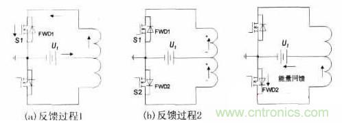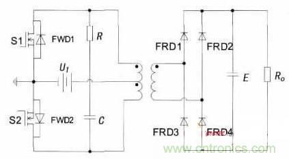 當(dāng)S1開通時,其漏源電壓uDS1只是一個開關(guān)管的導(dǎo)通壓降,在理想情況下可假定uDS1=0,而此時由于在繞組中會產(chǎn)生一個感應(yīng)電壓,并且根據(jù)變壓器初級繞組的同名端關(guān)系,該感應(yīng)電壓也會疊加到關(guān)斷的S2上,從而使S2在關(guān)斷時承受的電壓是輸入電壓與感應(yīng)電壓之和約為2UI.在實(shí)際中,變壓器的漏感會產(chǎn)生很大的尖峰電壓加在S2兩端,從而引起大的關(guān)斷損耗,變換器的效率因受變壓器漏感的限制,不是很高。在S1和S2的漏極之間接上RC緩沖電路,也稱為吸收電路,用來抑制尖峰電壓的產(chǎn)生。并且為了給能量回饋提供反饋回路,在S1和S2兩端都反并聯(lián)上續(xù)流二極管FWD.