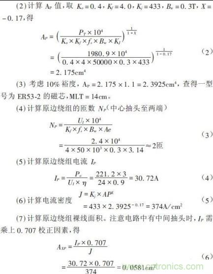 采用面積乘積(AP)法進(jìn)行設(shè)計(jì)。對于推挽逆變工作開關(guān)電源,原邊供電電壓UI=24V,副邊為全橋整流電路,期望輸出電壓UO=220V,輸出電流IO=3A,開關(guān)頻率fs=25kHz,初定變壓器效率η=0.9,工作磁通密度Bw=0.3T.