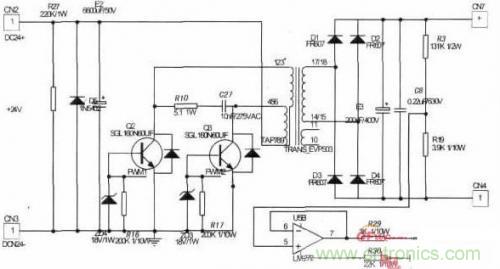 圖5為簡化后的主電路。輸入24V直流電壓,經(jīng)過大電容濾波后,接到推挽變壓器原邊的中間抽頭。變壓器原邊另外兩個抽頭分別接兩個全控型開關(guān)器件IGBT,并在此之間加入RC吸收電路,構(gòu)成推挽逆變電路。推挽變壓器輸出端經(jīng)全橋整流,大電容濾波得到220V直流電壓。并通過分壓支路得到反饋電壓信號UOUT.