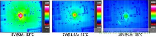 bq51025 10W無線接收器輸出電壓可在5V至10V的范圍內(nèi)用外部反饋電阻器進行調(diào)節(jié)。這樣就可實現(xiàn)對一節(jié)或兩節(jié)串聯(lián)電池配置的充電,并且在與一個寬輸入電壓范圍開關(guān)模式NVDC類型充電器組合在一起時,能夠保持單節(jié)電池充電情況下的高效率。在諸如無線RX輸出情況下,NVDC充電器架構(gòu)在減少較高電壓電源所需的輸入電流的同時,可實現(xiàn)低壓電池的高效充電。圖3顯示的是無線接收器電路板在為負載提供一個10W電源的同時,在5V,7V和10V輸出設(shè)置下的熱響應(yīng)(分別為圖。 3a,b和c)。很明顯,10V輸出情況下產(chǎn)生的熱量最少,應(yīng)該在高頻開關(guān)模式充電器可用于電池充電的情況下使用。