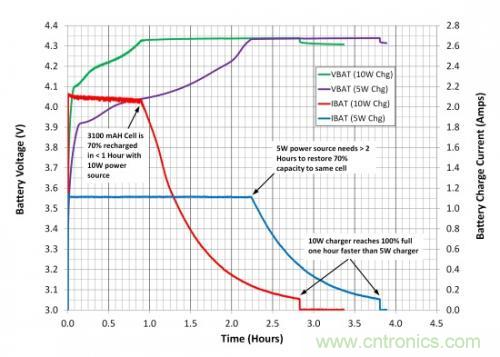 最后,執(zhí)行一個10W無線電源系統(tǒng)的原因是減少高容量電池的充電時間。圖8顯示了與bq24261 NVDC開關(guān)模式充電器組合使用時,使用5W和10W無線電源系統(tǒng)時針對3.1Ah鋰離子電池的充電時間。充電時間被大幅減少—從使用5W充電器時接近4個小時減少到使用10W充電器時的少于3小時。由于鋰離子電池充電算法的逐漸降低“漸止”屬性,總充電時間的減少值與提供的電源不直接成比例。然而,代表滿充電狀態(tài)大約70%的恒定電流到恒定電壓模式的轉(zhuǎn)換點減小到了原來的一半(圖8)。