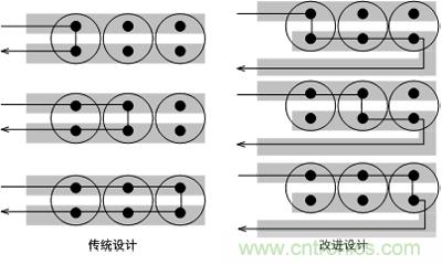 輸出濾波電容放置及走線對紋波噪聲至關(guān)重要,如圖1所示,傳統(tǒng)設(shè)計中由于到達每個電容的阻抗不一樣,所以高頻電流在三個電容中分配不均勻,改進設(shè)計中可以看出每個回路長度相當即高頻電流會均勻分配到每個電容中。