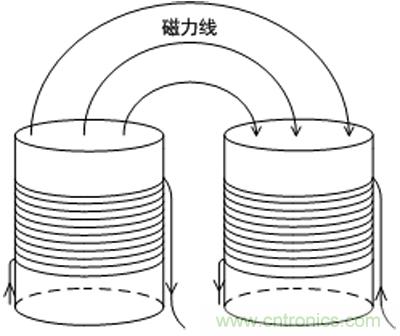 LC對噪聲和紋波抑制效果比較明顯,根據(jù)紋波頻率選擇合適電感電容值,但由于柱形電感價格低體積小的優(yōu)點,所以一般LC中電感大都會選擇柱形電感,然而柱形電感是開放式磁結(jié)構(gòu),對周圍會產(chǎn)生較嚴重磁干擾,我們可以采用兩個電感并排放置,且電流流入方向相反,即有助于引導磁通從一個磁柱到另一個磁柱,從而可以降低電磁干擾,如圖3所示。
