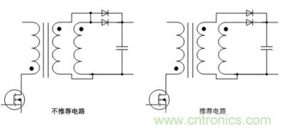 當電源輸出電流較大時,通常我們會采用兩個繞組并聯(lián)的方式進行使用,這兩個繞組通常分置于原邊繞組內(nèi)外,所以直流阻抗會略有差異,從而有可能產(chǎn)生內(nèi)部環(huán)流,電壓波形也會出現(xiàn)嚴重的振鈴,并且電磁干擾會變的更加嚴重,以及有可能會出現(xiàn)意外的大量發(fā)熱,如果輸出繞組一定需要并聯(lián)使用,最好采用如圖4的推薦電路,圖4推薦電路中二極管可以消除兩個不同繞組的不均勻?qū)е碌呢撁嬗绊憽?/div>