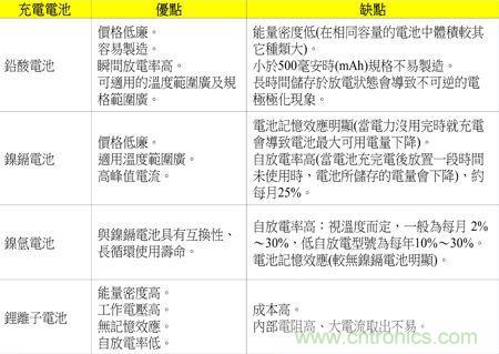 由表1優(yōu)缺點(diǎn)看來(lái),鎳鎘、鎳氫及鋰離子電池較適合使用在電子產(chǎn)品上;而鋰離子電池?zé)o論是在體積、重量及容量(電子產(chǎn)品的使用時(shí)間)較優(yōu)于鎳鎘、鎳氫電池,也無(wú)記憶效應(yīng)的問(wèn)題,所以鋰離子電池在電子產(chǎn)品使用上似乎方便許多。