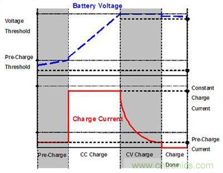 因鋰離子電池的特性,若鋰離子電池在充電之前已深度放電,此時(shí)充電器會(huì)先以微弱電流對(duì)電池進(jìn)行Pre-Charge充電(各家廠商設(shè)定值不同,本文使用范例的充電IC設(shè)定值約為10%的最大充電電流),充電時(shí)電池電壓上升。