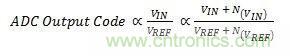 這個(gè)影響與ADC的基本任務(wù)相關(guān);而ADC的基本任務(wù)就是提供一個(gè)輸出代碼,來表示輸入信號(hào)電壓與基準(zhǔn)電壓的比率。輸入和基準(zhǔn)電壓都會(huì)將一個(gè)噪聲項(xiàng)添加到這個(gè)比率中,如方程式1所示: