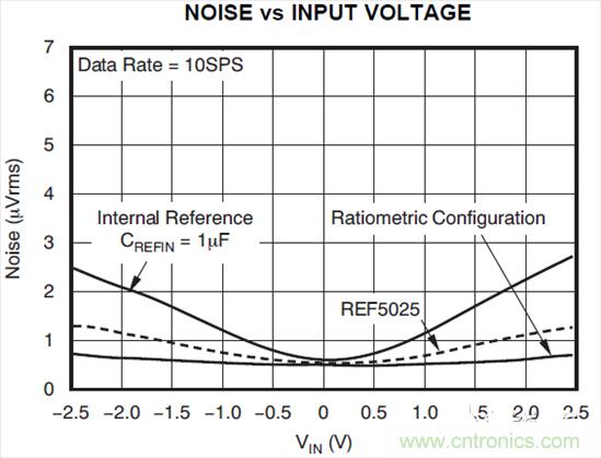 當(dāng)通過使用均方根增加的方法將基準(zhǔn)噪聲添加到ADC的噪聲中時(shí),這個(gè)組合噪聲是輸入電壓的函數(shù),它會(huì)在正或負(fù)輸入電壓變大時(shí)增加。在圖2中的曲線上,有幾個(gè)點(diǎn)需要注意: