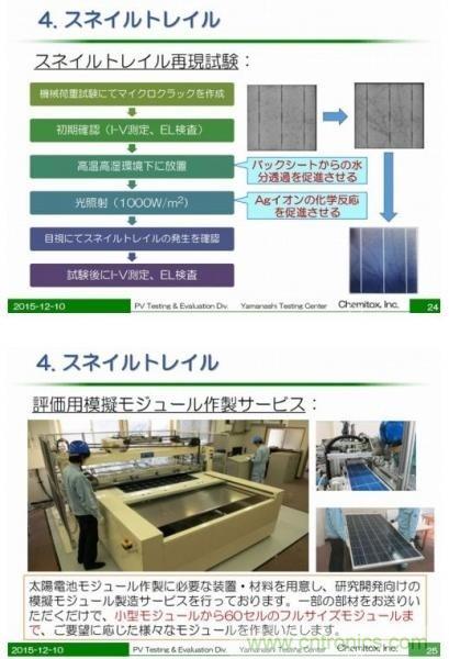 Chemitox提供制作這種驗證用太陽能電池板和再現(xiàn)蝸牛紋產(chǎn)生條件的服務(wù),推動了開發(fā)。例如,封裝材料廠商只需帶來想驗證的封裝材料,從電池板的制作到評測就就能全部完成。
