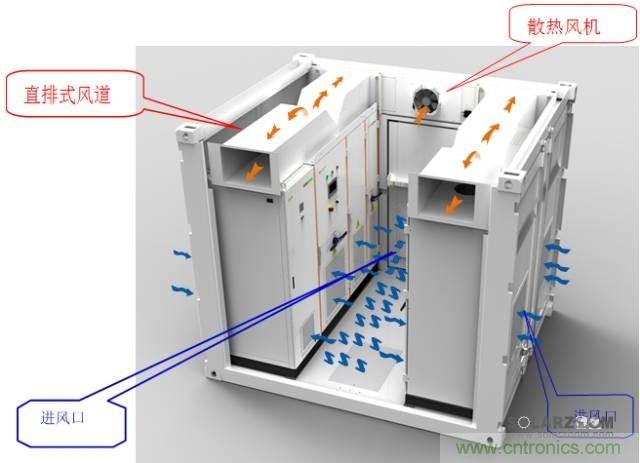 陽光電源箱式逆變房將逆變器、直流柜、通訊單元集成于一體,采用簡潔的分段直排式風(fēng)道,風(fēng)道內(nèi)不含風(fēng)機(jī),零損耗,免維護(hù)。風(fēng)道長度僅1m,壓力損失小,風(fēng)機(jī)處于最佳效率狀態(tài)。逆變器在工作時(shí),大部分熱量通過風(fēng)道排出集裝箱外,僅有少量熱量通過輻射傳到箱體內(nèi)部,內(nèi)部空氣吸收熱量后向頂部流動(dòng),再由集裝箱頂部排風(fēng)扇排出,確保了逆變器的長期可靠運(yùn)行。