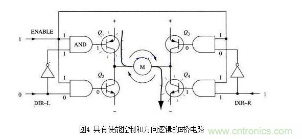 改進電路在基本H橋電路的基礎(chǔ)上增加了4個與門和2個非門。4個與門同一個“使能”導(dǎo)通信號相接,這樣,用這一個信號就能控制整個電路的開關(guān)。而2個非門通過提供一種方向輸人,可以保證任何時候在H橋的同側(cè)腿上都只有一個三極管能導(dǎo)通。(與本節(jié)前面的示意圖一樣,圖4所示也不是一個完整的電路圖,特別是圖中與門和三極管直接連接是不能正常工作的。)