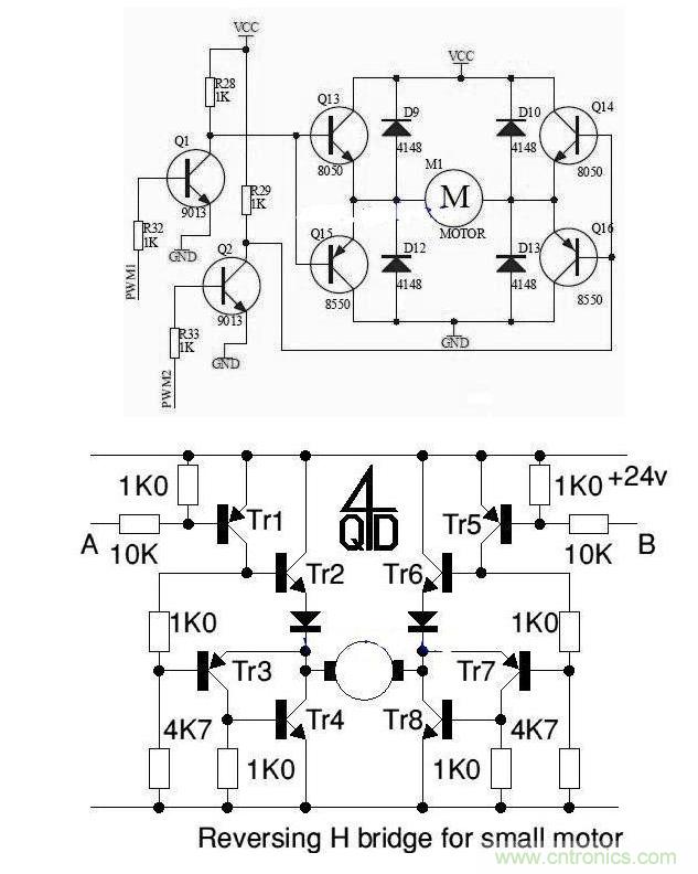 驅(qū)動電機時,保證H橋上兩個同側(cè)的三極管不會同時導(dǎo)通非常重要。如果三極管Q1和Q2同時導(dǎo)通,那么電流就會從正極穿過兩個三極管直接回到負(fù)極。此時,電路中除了三極管外沒有其他任何負(fù)載,因此電路上的電流就可能達到最大值(該電流僅受電源性能限制),甚至燒壞三極管?;谏鲜鲈?,在實際驅(qū)動電路中通常要用硬件電路方便地控制三極管的