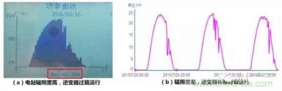湖北某電站采用30kW組串式逆變器,由于所選逆變器的直流輸入能力不足,單臺逆變器直流側(cè)最大只能配置30kWp的組件,即容配比1:1。當(dāng)光照資源相對較差,即使在全年輻照最高時,逆變器實(shí)際輸出功率也僅為25kW,如圖1(b)所示。逆變器及