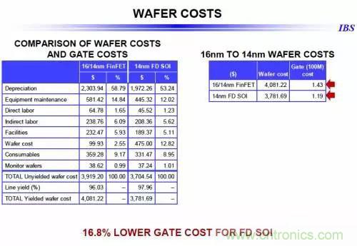 IBS 首席執(zhí)行官Handel Jones則比較了16/14納米FinFET與14納米FD SOI的晶圓成本與單位