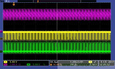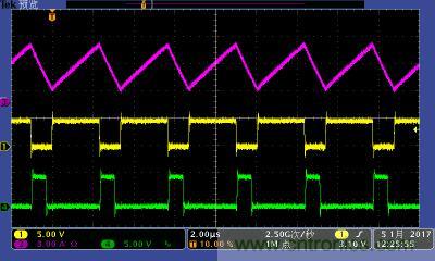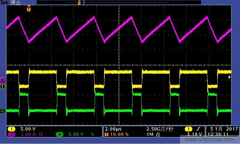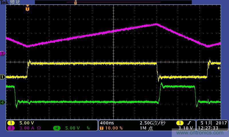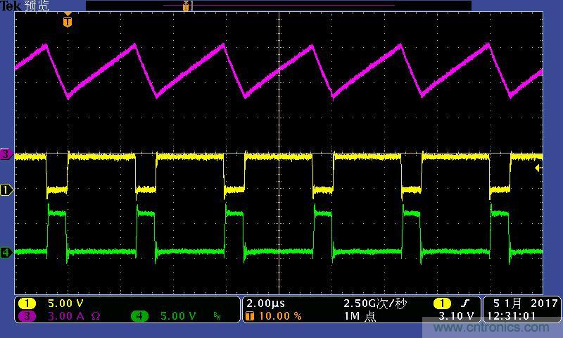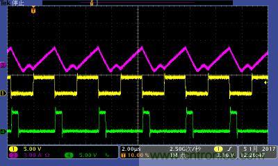 注:功率電感電流波形及高低端MOS管驅(qū)動波形。其中:①黃色:高端驅(qū)動波形;④綠色:低端驅(qū)動波形;③紫色:電感電流