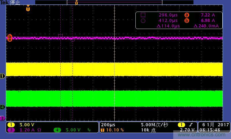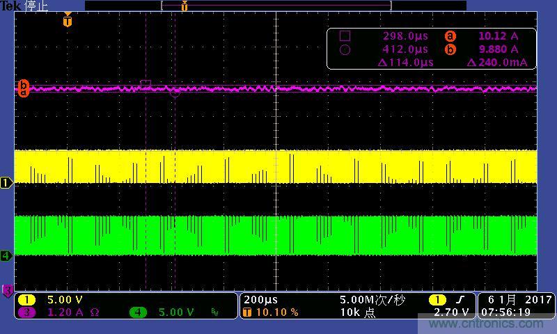 注:4A/7A/10A時的輸出電流波形。其中:①黃色:高端驅(qū)動波形;④綠色:低端驅(qū)動波形;③紫色:輸出電流