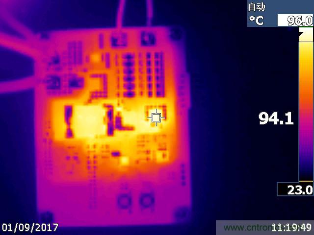 Q1(高端MOS):94.1℃;Q3(低端MOS):88.8℃;Q2(輸出開關(guān)MOS):72.5℃;L1(功率電感):89.4℃;U2(控制芯片):88.5℃