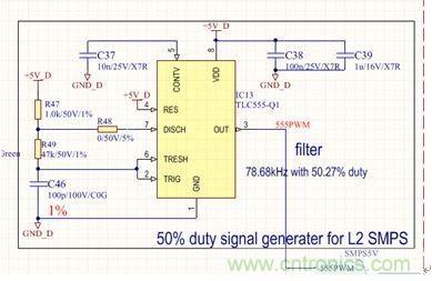 前級電源屬于典型定壓設(shè)計,無需給出設(shè)計原理,本文重點介紹后級半橋電路。具體原理圖見圖2和圖3。圖2為采用汽車級定時器電路設(shè)計的50%占空比信號發(fā)生器,用于給半橋開關(guān)電源提供控制信號,其中R49可以用來調(diào)整開關(guān)頻率,一般可以設(shè)定在70kHz到300kHz之間,頻率選擇主要根據(jù)電路板實際空間尺寸和變壓器的伏秒積進(jìn)行折衷選取。