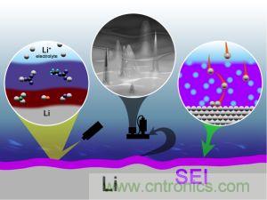 金屬鋰負極應用繞不開的是鋰枝晶的問題,早期人們對于鋰枝晶的認識主要來自于其他金屬電解過程中枝晶產生機理,對于鋰電池內鋰枝晶形成機理更多是“猜測”。而在2014年,美國橡樹嶺國家實驗室的Robert L. Sacci等「2」利用原位透射電鏡技術直接在玻璃碳表面觀測到了鋰枝晶的形成過程,從下面的動畫可以看到,不同于傳統(tǒng)的枝晶的概念,鋰枝晶首先以球形出現(xiàn)的,其表面擁有一些納米球,這些納米球具有一定角度的小面,隨后的在一次鋰顆粒的表面進行的二次結晶生長,會產生許多其他形狀的鋰晶體,如球形、多面體和針狀等。