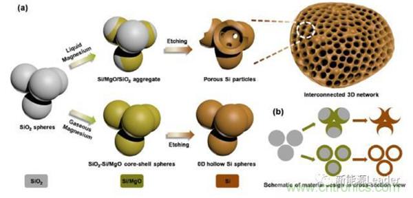 晶體Si的優(yōu)勢是容量高,首效高,缺點是體積膨脹大,為了克服這一問題,工業(yè)上一般是將晶體Si制成納米顆粒,分散在石墨之中,利用石墨吸收Si的體積膨脹。也可以將Si材料制成特殊形狀,例如Si納米線,蜂巢狀Si等。浙江大學的Hao Wu等「4」利用鎂熱反應制成了蜂窩狀的硅材料,如下圖所示,獨特的蜂窩狀結構能夠很好的吸收Si的體積膨脹,顯著改善了循環(huán)性能,循環(huán)800次容量仍然可達1058mAh/g,容量保持率為91%。