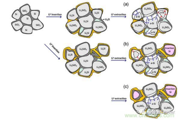同樣來自韓國的Insoo Choi等[7]還對SiOX失效機理進行了分析,實驗中Insoo Choi發(fā)現(xiàn),Si/SiOX/C復合電極的失效模式分為兩類,一類是局部實效,一類是全面實效。局部失效主要是在充放電過程中Si/SiOX反復膨脹,SEI膜變厚,導致活性物質顆粒與導電網絡失去連接,部分嵌鋰的Si顆粒不再參與到充放電反應之中,導致電池容量的衰降。全局失效模式主要是因為粘結劑失效等原因,導致負極粉化掉料,引起活性物質損失。