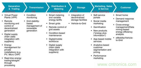 數(shù)據(jù)主導(dǎo)的智慧正在或多或少地進(jìn)入能源價(jià)值鏈的所有步驟中,突出的重點(diǎn)是發(fā)電,配電,計(jì)量和消費(fèi)。圖4中更詳細(xì)地說(shuō)明了IoT應(yīng)用程序擴(kuò)展到能源價(jià)值鏈中(請(qǐng)注意,每個(gè)國(guó)家的能源價(jià)值鏈會(huì)稍有不同;例如,英國(guó)的智能電表是零售業(yè))。