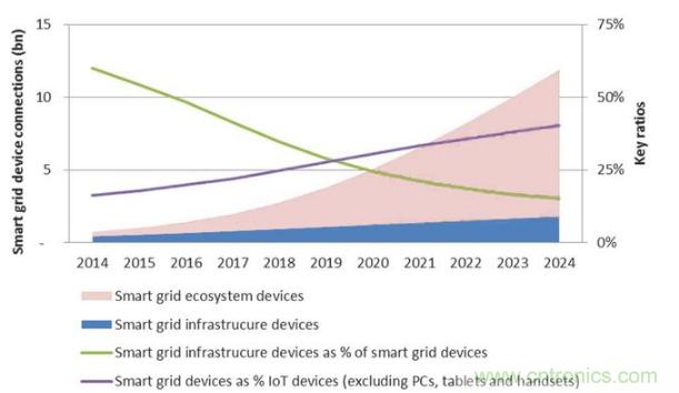 這些數(shù)字有三個(gè)明確的信息。首先,物聯(lián)網(wǎng)智能電網(wǎng)中包括的設(shè)備總量預(yù)計(jì)將迅速增長(zhǎng),從今天的不到10億而2024年增加將達(dá)到120億。第二,也許不奇怪的是,在依賴于智能電網(wǎng)功能的設(shè)備之前,將采用與智能電網(wǎng)基礎(chǔ)設(shè)施相關(guān)的設(shè)備。第三,與智能電網(wǎng)相關(guān)的設(shè)備將占據(jù)連接設(shè)備的越來(lái)越多的份額。這些預(yù)測(cè)顯示,到2024年,預(yù)計(jì)所有物聯(lián)網(wǎng)設(shè)備云連接(不包括PC,平板電腦和手機(jī))的40%以上屬于智能電網(wǎng)生態(tài)系統(tǒng),將智能電網(wǎng)和VPP概念牢固地置于物聯(lián)網(wǎng)(IoT)的核心之中。