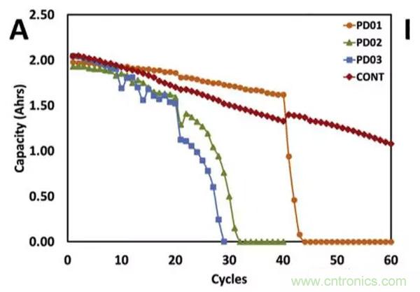 針對三個階段電池的衰降機理的研究認(rèn)為,階段1可能是因為電池SEI膜生長需要消耗一部分Li+,因此衰降速度較快。在階段2隨著SEI膜結(jié)構(gòu)的穩(wěn)定,內(nèi)部較為穩(wěn)定,因此衰降速度較慢,在階段3隨著電池老化,開始發(fā)生活性物質(zhì)損失,電極活性界面減少,導(dǎo)致電池對于電流十分敏感。圖C是針對不同的截止電壓對電池衰降速度影響的實驗,從實驗結(jié)果可以看到,當(dāng)把充電截止電壓提高到4.3V時會導(dǎo)致電池的循環(huán)性能急劇惡化,降低充電截止電壓可以有效的改善電池的循環(huán)性能。