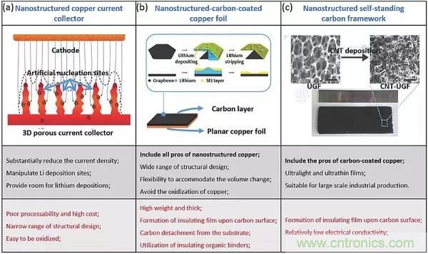鋰粉末和表面改性的鋰箔可以作為平面鋰箔的替代物,以延遲枝晶的產生。負極的表面積大大增加以提供相當大的沉積位置,從而在一段時間內抑制枝晶生長。然而,鋰箔的表面狀態(tài)和粉末之間的邊界不會持續(xù)很長時間,并且整個箔在長時間循環(huán)中會變成隨機分散的鋰微結構的聚集體。相比之下,集流體(CCs)方法取得了較好的表現(xiàn),傳統(tǒng)銅箔被納米結構化的材料代替。之后為了避免納米結構銅的缺點,開發(fā)了碳涂覆的銅箔,這些碳涂層都貢獻了更好的電化學性能,這與其優(yōu)異的導電性、高比表面積和合適的孔徑/體積比具有密切的關系。與納米結構或碳涂層銅箔相比,自支撐碳膜本身可直接作為CCs,能夠避免有機粘合劑或碳脫落產生的導電性所帶來的不利影響。