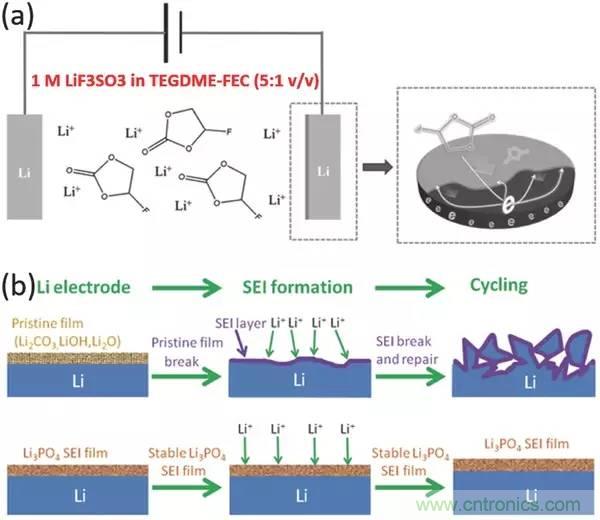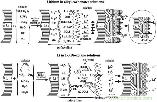 通常,本征SEI層由各種有機物(低聚物和聚合物)和無機物組成,其中有機部分賦予SEI層柔性以適應鋰沉積,而無機部分能夠實現(xiàn)快速的鋰離子傳輸。然而,無機碳酸鋰(Li2CO3)和鋰乙烯碳酸氫鈉(LEDC)作為兩個主要的SEI組分,在鋰沉積電位附近是熱力學不穩(wěn)定的,并且允許循環(huán)中反應發(fā)生,而氧化鋰(Li2O)是唯一的熱力學和動力學穩(wěn)定的組分,最里面的SEI層中的Li2O薄層是非常重要的,以避免在沒有氟化物源的情況下破裂。此外,化學和物理各向異性在SEI層內是常見的,同時導致異質鋰通量和不均勻沉積。沉積和溶解時,由無機離子香料組成的表面不能適應形態(tài)變化,因此可能會分解,導致高度不均勻的鋰沉積,使得枝晶形成。迄今為止,選擇合適的溶劑、鋰鹽和添加劑可以有效和高效地調節(jié)SEI層的性質。