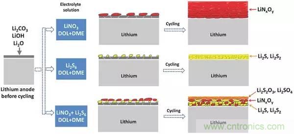 圖7.具有相同LiTFSI-DOL成分的不同電解質中鋰負極循環(huán)的表面膜行為